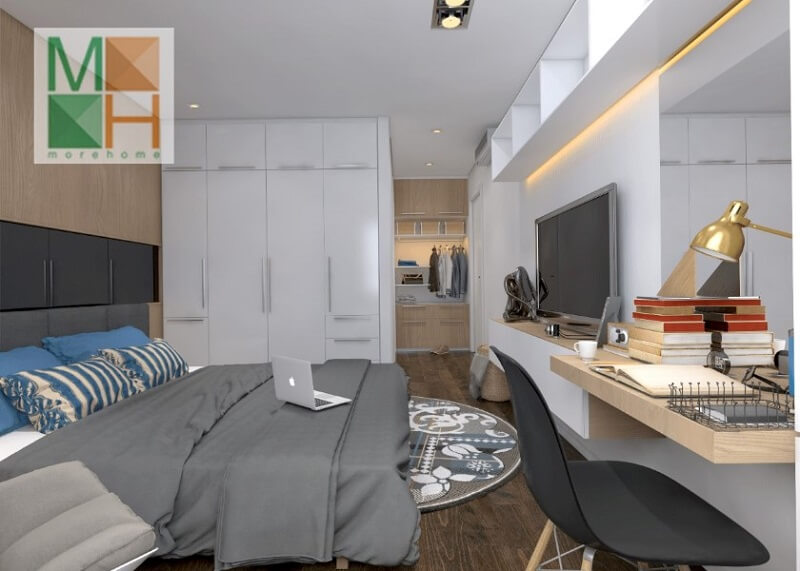 Thiết kế phòng ngủ đẹp với đò nội thất tông màu sáng kết hợp tủ quần áo âm tường, ti vi treo tường, bàn làm việc nhỏ nhắn tiết kiệm tối đa không gian căn phòng