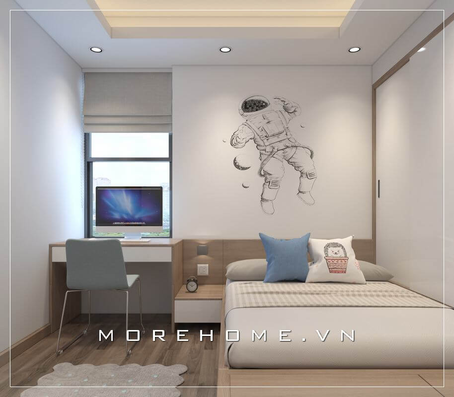 Nội thất phòng ngủ gỗ công nghiệp với các chi tiết đơn giản hiện đại, tạo độ thông thoáng cho phòng ngủ con trai chung cư
