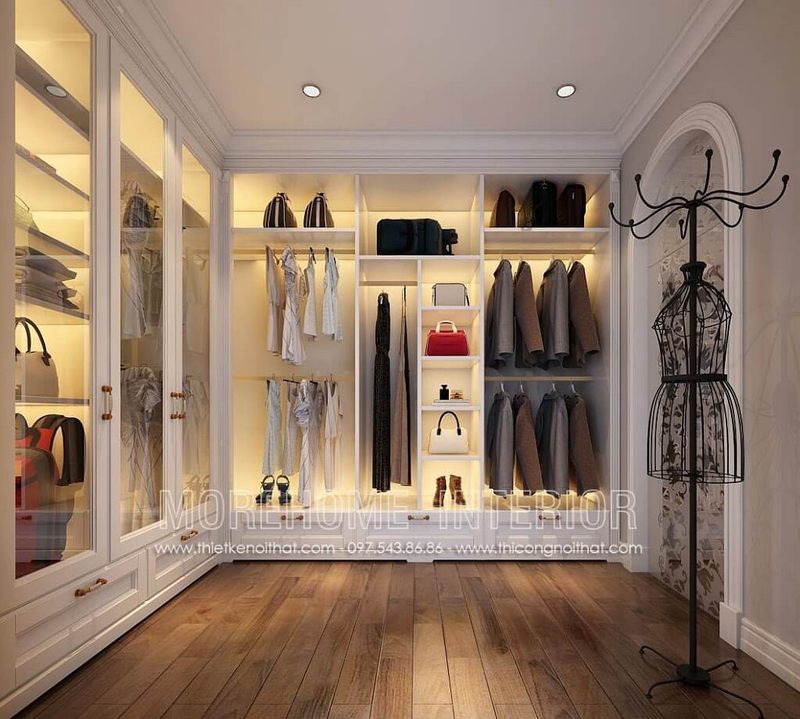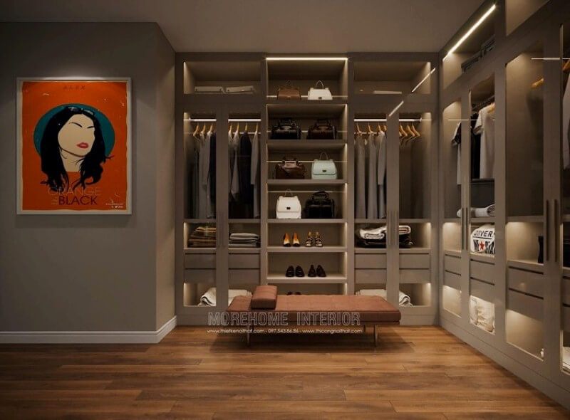Thiết kế phòng thay đồ mở phong cách hiện đại với ý tưởng sử dụng tủ quần áo cửa kính cường lực trong suốt sẽ giúp bạn lựa đồ một cách nhanh chóng.