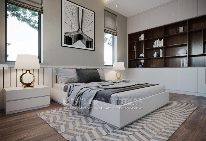 Tủ kệ đựng đồ phòng ngủ có thể chiếm nhiều diện tích nhưng nhờ lớp phủ sơn trắng, căn phòng sẽ trở nên rộng rãi và đẹp mắt.