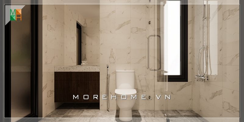 Gia chủ đã chọn đá nhân tạo solid surface để ốp mặt tủ lavabo, đây là một trong những loại đá được ưa chuộng trong thời gian gần đây.