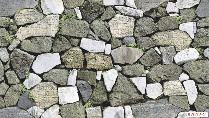 Mẫu giấy dán tường giả đá tự nhiên có chữ in và màu rêu xanh số 87012-2.